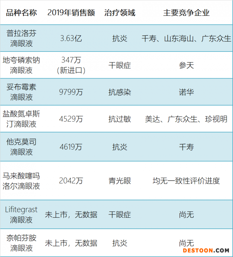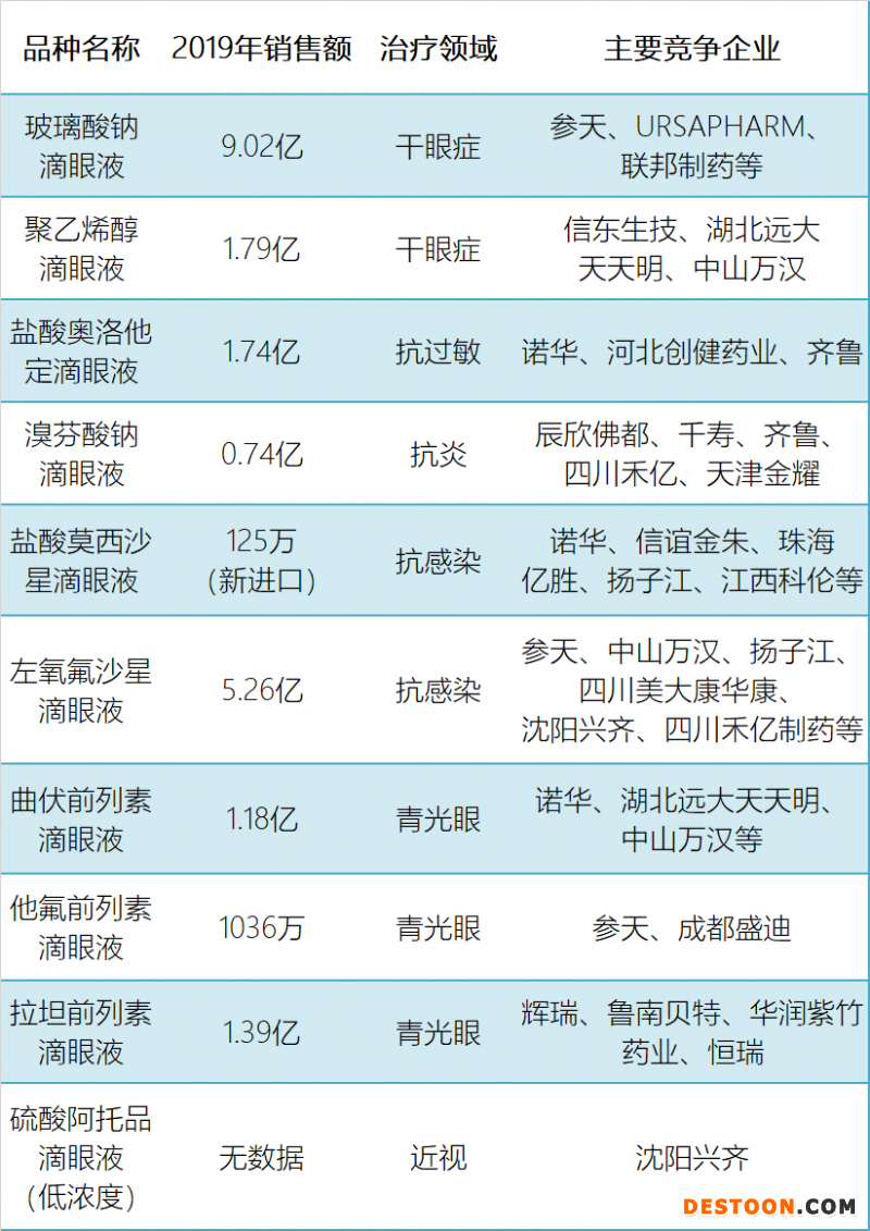除玻璃酸鈉外,其他關(guān)注度較高的產(chǎn)品有聚乙烯醇、奧洛他定、莫西沙星、左氧氟沙星、曲伏前列素、拉坦前列素、他氟前列素和硫酸阿托品。詳細(xì)市場和競爭情況如下: