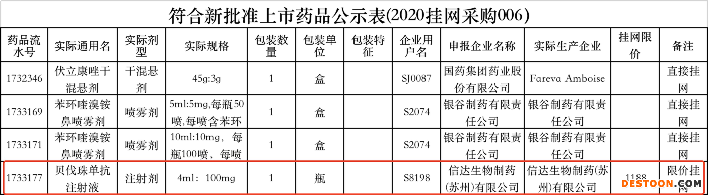 近日,陜西省公共資源交易中心發(fā)布《新批準(zhǔn)上市藥品相關(guān)信息》,信達(dá)生物的貝伐珠單抗注射液掛網(wǎng)價被公布,價格為1188元/瓶(4ml:100mg)。