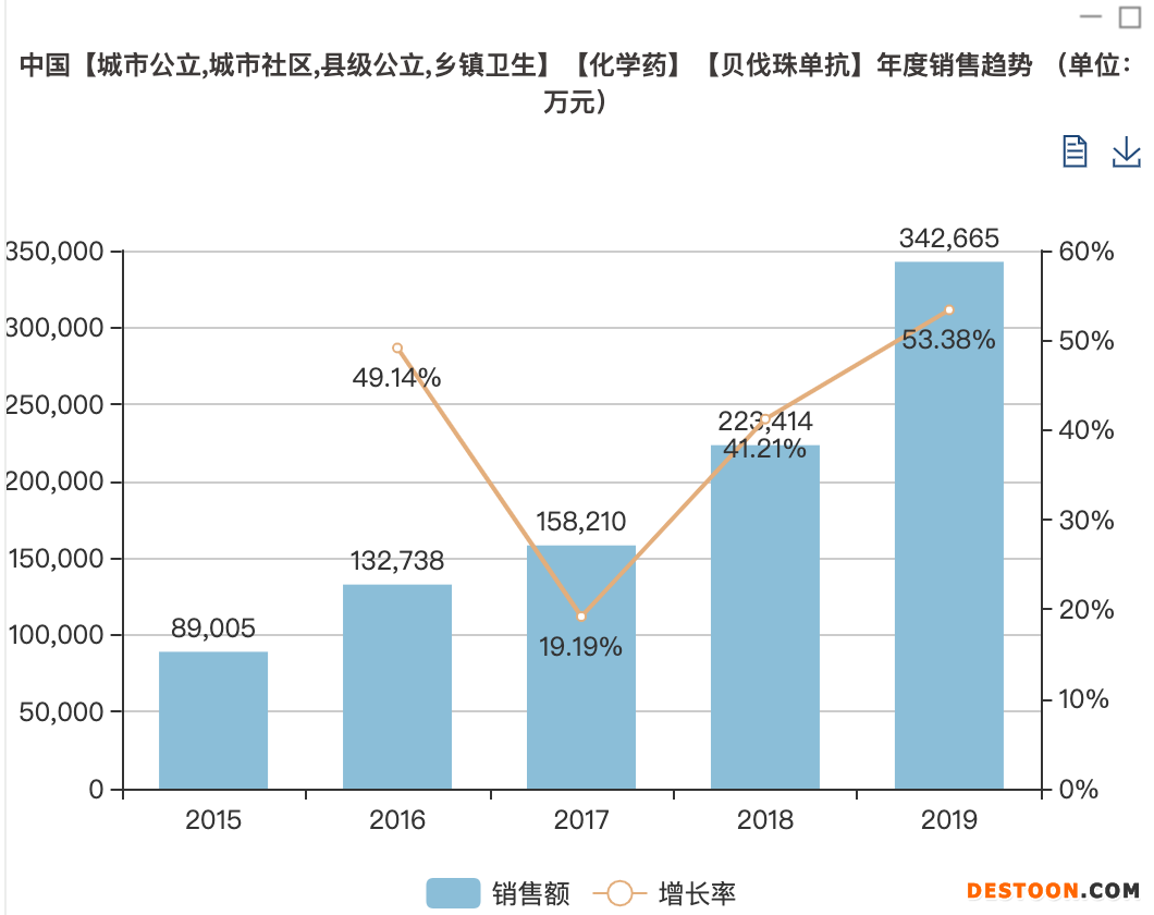 賽柏藍(lán)在米內(nèi)網(wǎng)數(shù)據(jù)庫查詢發(fā)現(xiàn),貝伐珠單抗2019年在全國公立醫(yī)院終端的銷售表現(xiàn)為34.3億元,2015年至2019年一直保持上升趨勢。