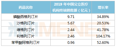相比其它口服降糖藥,DPP-4抑制劑因口服吸收迅速、不易誘發(fā)低血糖和增加體重等優(yōu)點(diǎn),得到市場(chǎng)的歡迎。米內(nèi)網(wǎng)數(shù)據(jù)顯示,2019年中國(guó)公立醫(yī)療機(jī)構(gòu)終端5款DPP-4抑制劑銷售表現(xiàn)均不俗!利格列汀片以104.17%的銷售增長(zhǎng)率領(lǐng)跑,磷酸西格列汀片年銷售額逼近10億元,苯甲酸阿格列汀片銷售額即將邁過億元大關(guān)。