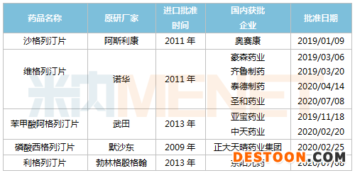 目前國(guó)內(nèi)已獲批上市的DPP-4抑制劑有5款,分別為西格列汀、沙格列汀、維格列汀、利格列汀和阿格列汀??傮w上,5款DPP-4抑制劑原研藥均已獲批進(jìn)口多年,首仿則相繼在2019年、2020年獲批上市。