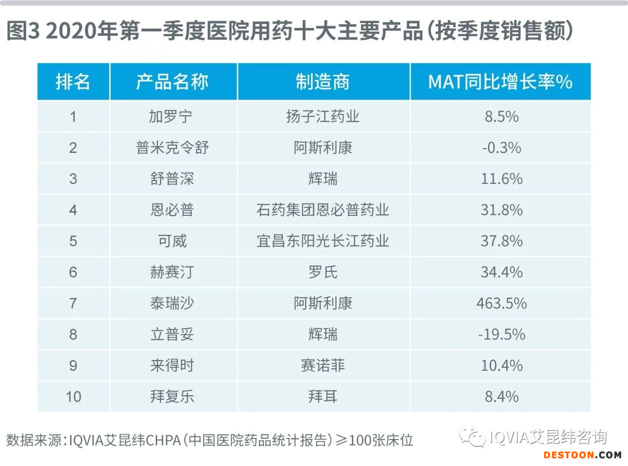 據(jù)IQVIA,受疫情影響,2020年第一季度,各品類的季度銷售額同比下降明顯,但抗腫瘤藥受疫情影響較小,這也直接體現(xiàn)到赫賽汀和泰瑞沙的排名上。