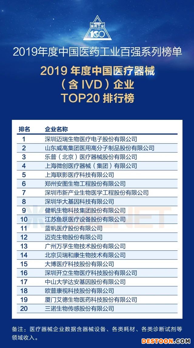 在2019年度中國醫(yī)療器械(含IVD)企業(yè)TOP20排行榜中,邁瑞醫(yī)療、威高股份、樂普醫(yī)療位列前三甲;