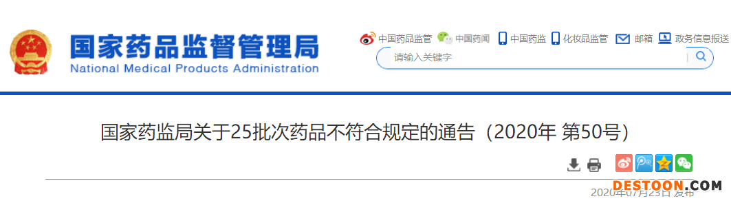 醫(yī)藥網(wǎng)7月27日訊 7月23日,國家藥監(jiān)局發(fā)布了“關(guān)于25批次藥品不符合規(guī)定的通告(2020年 第50號)”(以下簡稱“通告”)。