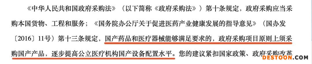 《中華人民共和國政府采購法》(以下簡稱《政府采購法》)第十條規(guī)定,政府采購應當采購本國貨物、工程和服務;《國務院辦公廳關于促進醫(yī)藥產業(yè)健康發(fā)展的指導意見》(國辦發(fā)〔2016〕11號)第十三條規(guī)定,國產藥品和醫(yī)療器械能夠滿足要求的,政府采購項目原則上須采購國產產品,逐步提高公立醫(yī)療機構國產設備配置水平。