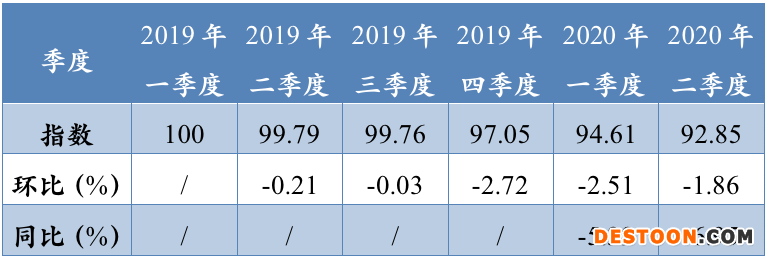 經(jīng)測(cè)算,基礎(chǔ)衛(wèi)生材料類醫(yī)用耗材2019年四季度起環(huán)比降幅分別為8.37%、4.96%和2.33%,2020年一季度和二季度同比降幅分別為13.85%和14.99%?;A(chǔ)衛(wèi)生材料類耗材整體價(jià)格下降促使二季度價(jià)格監(jiān)測(cè)指數(shù)下降1.9。