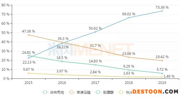 目前國(guó)內(nèi)市場(chǎng)常用的痛風(fēng)藥有非布司他、苯溴馬隆、別嘌醇、秋水仙堿及丙磺舒,其中前4個(gè)品種在2019年中國(guó)公立醫(yī)療機(jī)構(gòu)終端合計(jì)市場(chǎng)份額為99.99%,非布司他以73.36%的市場(chǎng)份額遙遙領(lǐng)先。