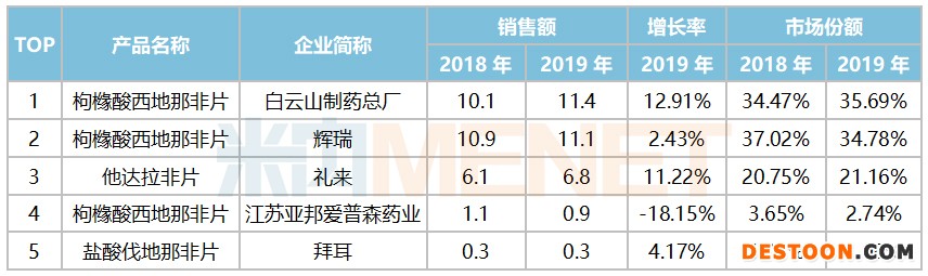 國內(nèi)市場中,輝瑞的最強對手白云山金戈于2014年首仿獲批上市,一路披荊斬棘,市場份額逐漸走高,2019年成功登頂,成為該品種的領軍企業(yè)。在米內(nèi)網(wǎng)中國城市零售藥店終端,白云山的金戈2016-2019年的銷售額增速分別為40.04%、42.78%、10.92%、12.91%,2018年已突破10億關口,2019年更漲至11.4億元。白云山在2019年年報中提到,枸櫞酸西地那非片銷售量同比增加較大的主要原因是公司借助良好的銷售渠道,不斷開發(fā)客戶,促進銷售量上升。