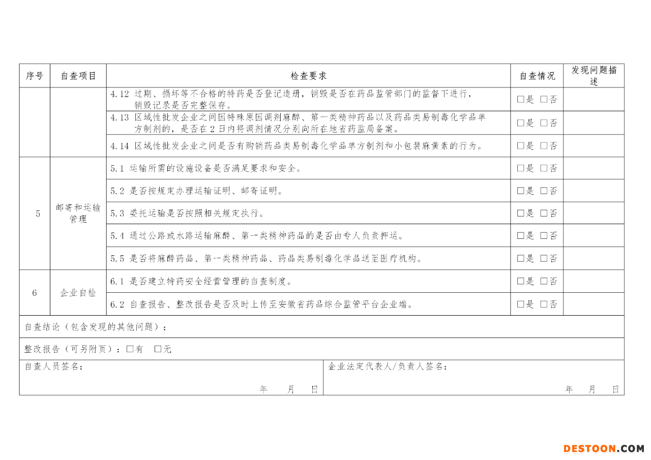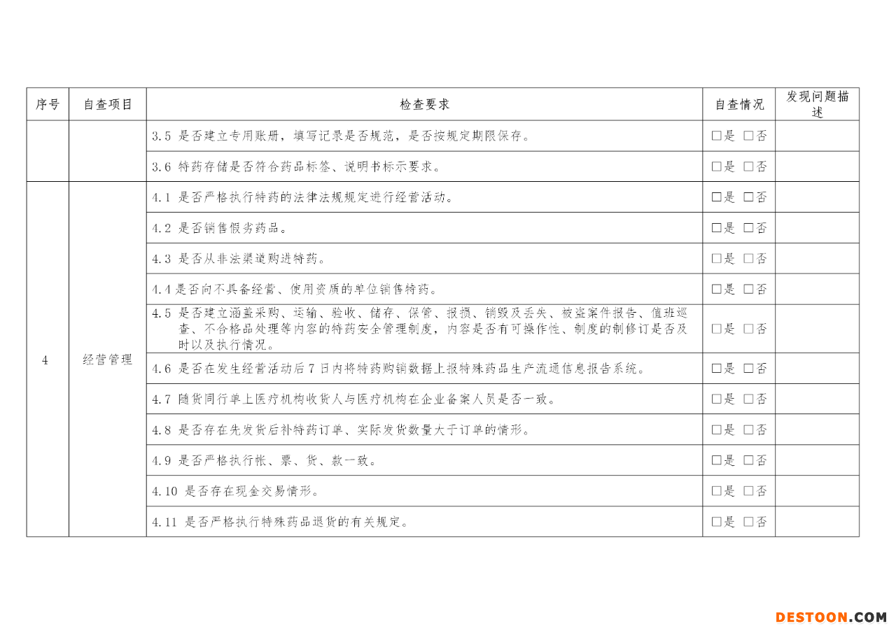 《自查通告》要求,特殊藥品經(jīng)營(yíng)企業(yè)應(yīng)當(dāng)于每年6月30日前和12月31日前按照《特殊藥品經(jīng)營(yíng)企業(yè)落實(shí)主體責(zé)任自查報(bào)告清單》各開展一次自查。