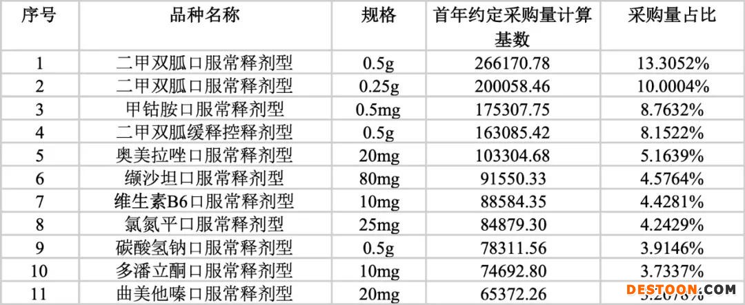 從品種名單和采購(gòu)量來(lái)看情況,二甲雙胍、甲鈷胺、奧美拉唑、纈沙坦、維生素B6、氯氮平、碳酸氫鈉、多潘立酮、曲美他嗪等9個(gè)品種,合并劑型之后的約定采購(gòu)量接近此次整體采購(gòu)量的七成。其中最為突出的二甲雙胍,合并口服常釋劑型和緩釋控釋劑型更是占比超過(guò)30%。