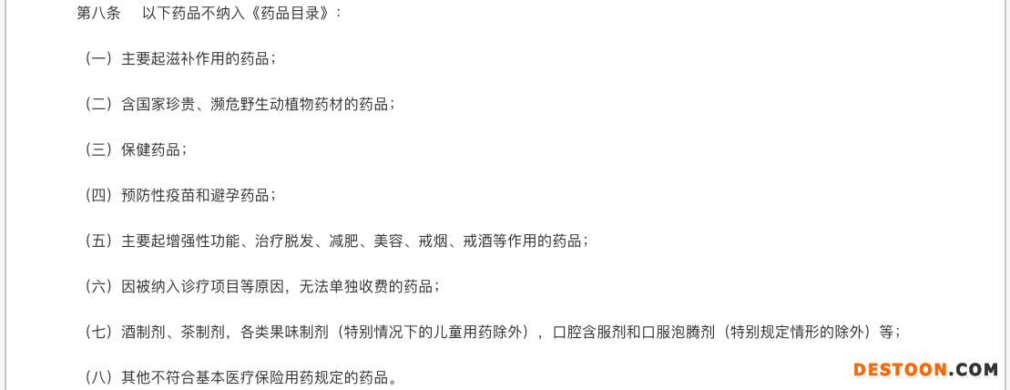 根據(jù)《辦法》第八條規(guī)定,主要起滋補作用的藥品、保健藥品等8大類別的藥品不納入醫(yī)保目錄: