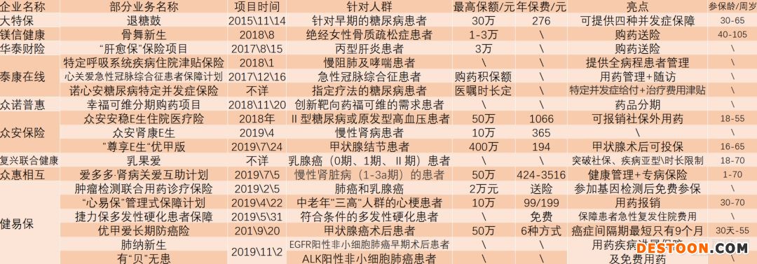 據(jù)動脈網(wǎng)整理,此前已有不少保險企業(yè)率先探索帶病保險,涉及的疾病領(lǐng)域包括糖尿病、骨質(zhì)疏松、丙肝、慢性腎病、肺癌、乳腺癌等。