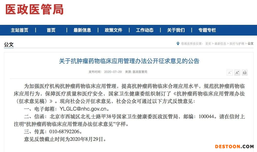 日前,國(guó)家衛(wèi)健委發(fā)布《抗腫瘤藥物臨床應(yīng)用管理辦法》(征求意見(jiàn)稿)(以下簡(jiǎn)稱《管理辦法》),旨在加強(qiáng)醫(yī)療機(jī)構(gòu)抗腫瘤藥物臨床應(yīng)用管理,提高抗腫瘤藥物臨床合理應(yīng)用水平,規(guī)范抗腫瘤藥物臨床應(yīng)用行為,保障醫(yī)療質(zhì)量和醫(yī)療安全。