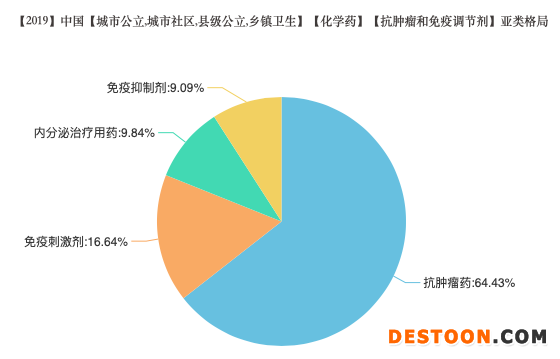 從細(xì)分類別來看,抗腫瘤藥的市場占比最高,高達(dá)64.43%,其次是免疫刺激劑16.64%,內(nèi)分泌治療用藥9.84%,免疫抑制劑9.09%。