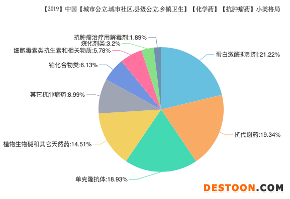 在抗腫瘤藥方面,目前國際上臨床常見的抗腫瘤藥物約80余種。其中,在我們臨床上使用最多的是蛋白激酶抑制劑,市場占比達(dá)到21.22%,其次是抗代謝藥19.34%,單克隆抗體18.93%。