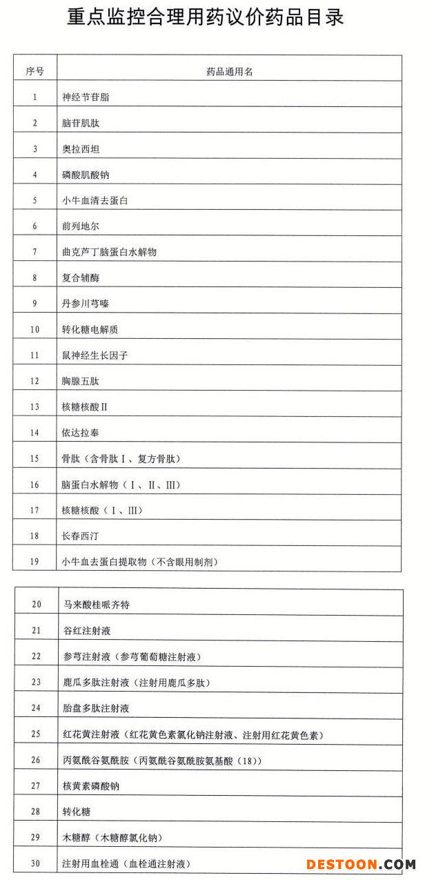 30個品種包括了20個第一批國家重點監(jiān)控合理用藥藥品目錄中的藥品,還有10個省級、武漢市醫(yī)療機構重點監(jiān)控藥品,化藥、中藥均在列,包括參芎注射液、鹿瓜多肽注射液、胎盤多肽注射液、丙氨酰谷氨酰胺、注射用血栓通(血栓通注射液)等。
