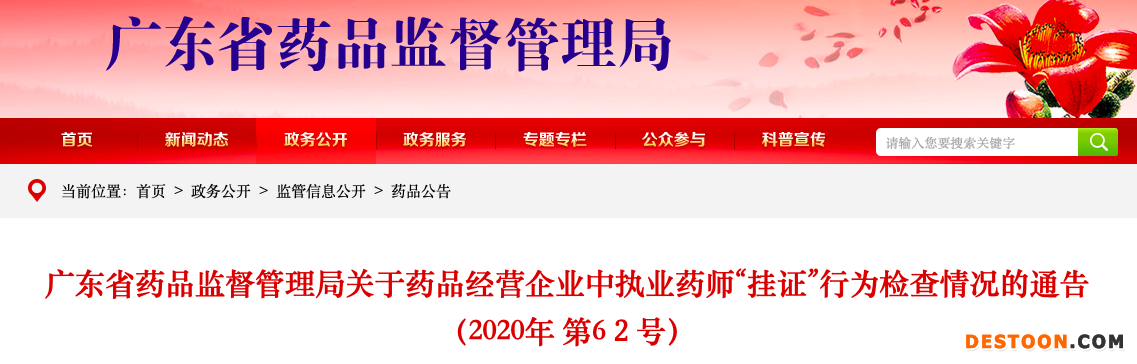 近日,廣東省藥監(jiān)局發(fā)布《關(guān)于藥品經(jīng)營企業(yè)中執(zhí)業(yè)藥師“掛證”行為檢查情況的通告 (2020年 第62號(hào))》。