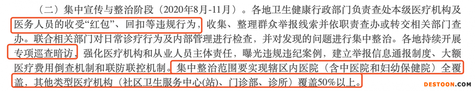 進入到8月份,就正式進入集中宣傳與整治階段。各地衛(wèi)生健康行政部門負責(zé)查處本級醫(yī)療機構(gòu)及醫(yī)務(wù)人員的收受“紅包”、回扣等違規(guī)行為,收集、整理群眾舉報線索并依職責(zé)查辦或轉(zhuǎn)交相關(guān)部門查辦。