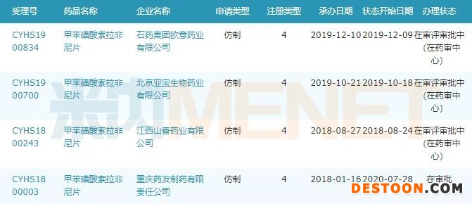 較早之前,甲苯磺酸索拉非尼片已經(jīng)吸引到了一批藥企的垂青,2016年有11家藥企的6類仿制上市申請(qǐng)獲批臨床,其中包括了輔仁藥業(yè)集團(tuán)、重慶藥友制藥、重慶圣華曦藥業(yè)、正大天晴藥業(yè)集團(tuán)、山東羅欣藥業(yè)、湖南科倫制藥、石藥集團(tuán)中奇制藥、齊魯制藥、江蘇豪森藥業(yè)等。重慶藥友制藥、江西山香藥業(yè)的4類仿制上市申請(qǐng)于2018年獲得承辦,目前重慶藥友制藥已經(jīng)進(jìn)入了審批流程,北京亞寶生物藥業(yè)、石藥集團(tuán)歐意藥業(yè)也于2019年入局,相關(guān)受理號(hào)在審評(píng)審批中。