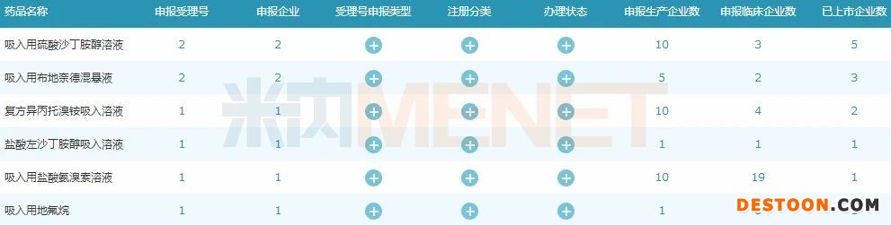 6個(gè)過(guò)評(píng)吸入劑中有5個(gè)為呼吸系統(tǒng)用藥,吸入用硫酸沙丁胺醇溶液、吸入用布地奈德混懸液、復(fù)方異丙托溴銨吸入溶液、鹽酸左旋沙丁胺醇吸入溶液均為抗哮喘藥,吸入用鹽酸氨溴索溶液為咳嗽與感冒用藥;恒瑞醫(yī)藥的吸入用地氟烷為神經(jīng)系統(tǒng)藥物,用于麻醉誘導(dǎo)和麻醉維持。