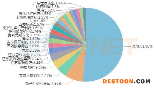 從廠家銷售格局來看,TOP10有8家是國內(nèi)企業(yè),外資企業(yè)僅有靈北和拜耳。而這8家國內(nèi)企業(yè)中有4家是江蘇的明星藥企,分別是揚(yáng)子江藥業(yè)、恒瑞醫(yī)藥、豪森藥業(yè)和恩華藥業(yè),4家合計(jì)市場份額超16%。