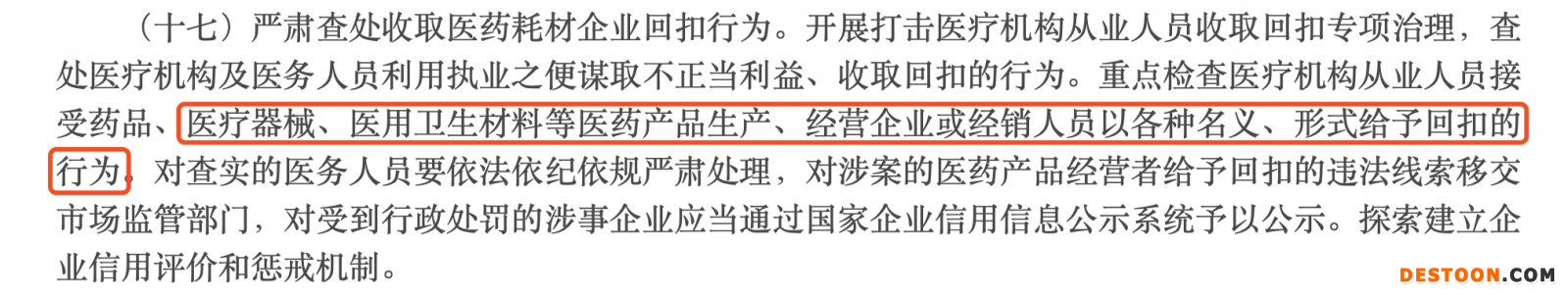 方案指出,將嚴(yán)肅查處收取醫(yī)藥耗材企業(yè)回扣行為。開展打擊醫(yī)療機(jī)構(gòu)從業(yè)人員收取回扣專項治理,查處醫(yī)療機(jī)構(gòu)及醫(yī)務(wù)人員利用執(zhí)業(yè)之便謀取不正當(dāng)利益、收取回扣的行為。