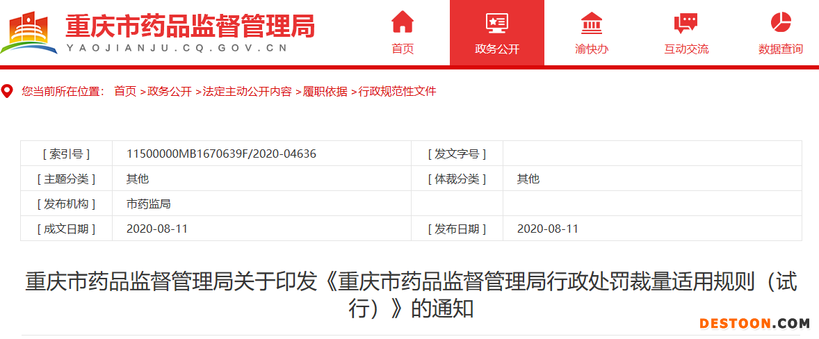 8月13日訊 新的《藥品管理法》實施后,各地針對該法陸續(xù)出臺了行政處罰裁量標(biāo)準(zhǔn)。8月11日,重慶市藥監(jiān)局印發(fā)了《重慶市藥品監(jiān)督管理局行政處罰裁量適用規(guī)則(試行)》(以下簡稱《規(guī)則》)。