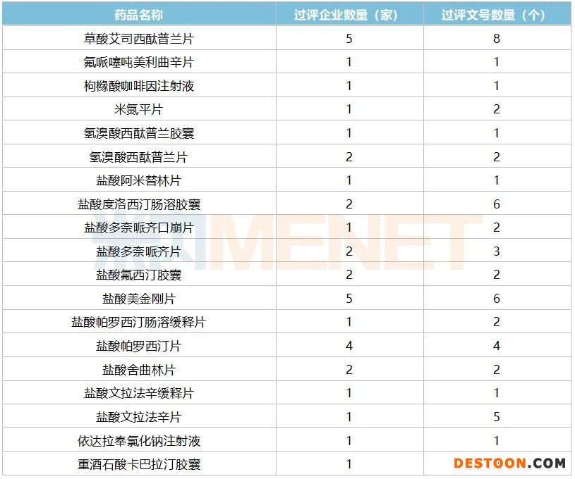米內(nèi)網(wǎng)數(shù)據(jù)顯示,截至目前,已過(guò)評(píng)的精神興奮藥達(dá)19個(gè)(批文數(shù)量達(dá)52個(gè)),僅1家過(guò)評(píng)的產(chǎn)品有11個(gè),包括了氟哌噻噸美利曲辛片、米氮平片、氫溴酸西酞普蘭膠囊、鹽酸阿米替林片、鹽酸多奈哌齊口崩片、鹽酸帕羅西汀腸溶緩釋片、鹽酸文拉法辛緩釋片、鹽酸文拉法辛片、依達(dá)拉奉氯化鈉注射液、重酒石酸卡巴拉汀膠囊,其中復(fù)星醫(yī)藥囊括了鹽酸阿米替林片(1個(gè)批文)、鹽酸文拉法辛片(5個(gè)批文)。
