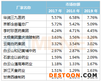 TOP10廠家中,華潤三九、京都念慈菴總廠、李時(shí)珍醫(yī)藥集團(tuán)、太極集團(tuán)重慶涪陵制藥和云南白藥位居前五,市場(chǎng)份額合計(jì)近24%。