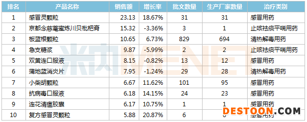 TOP10產(chǎn)品銷售額“門檻”超過5億元,感冒用藥占了6個(gè)席位。其中,感冒靈顆粒銷售額突破20億規(guī)模,板藍(lán)根顆粒躋身10億行列;獨(dú)家產(chǎn)品僅有京都念慈菴蜜煉川貝枇杷膏和連花清瘟膠囊。