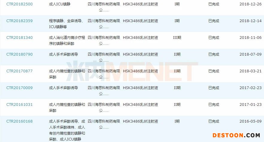 目前HSK3486乳狀注射液已在國(guó)內(nèi)登記18項(xiàng)臨床試驗(yàn)研究,消化道內(nèi)鏡診斷和治療鎮(zhèn)靜和/或麻醉、全身麻醉誘導(dǎo)2個(gè)適應(yīng)癥已完成III期臨床并申報(bào)上市,且均被納入優(yōu)先審評(píng),有望于2020年獲批。此次獲得國(guó)家藥監(jiān)局受理的的為適應(yīng)癥“全麻維持”Ⅲ期臨床試驗(yàn)申請(qǐng),若相關(guān)臨床試驗(yàn)成功,將有望進(jìn)一步拓寬該產(chǎn)品的適應(yīng)癥,增強(qiáng)市場(chǎng)競(jìng)爭(zhēng)力。