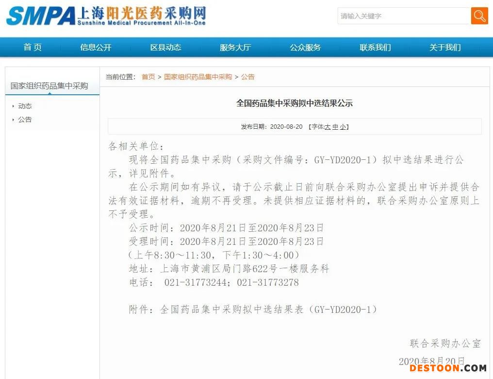 現(xiàn)將全國藥品集中采購(采購文件編號:GY-YD2020-1)擬中選結(jié)果進(jìn)行公示,詳見附件。