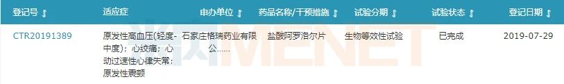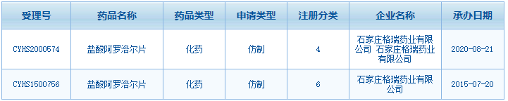 圖1:石家莊格瑞藥業(yè)的鹽酸阿羅洛爾片的注冊情況