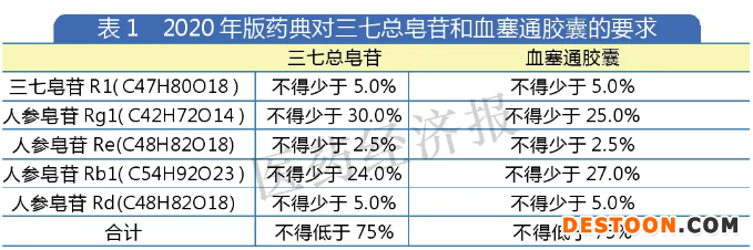 含量測定標(biāo)準(zhǔn)方面,2020年版藥典對(duì)三七總皂苷和血塞通膠囊的要求如表1。而若以“三七總皂苷”這種相對(duì)成分比較確定的中藥有效部位作為通用名,首先會(huì)遇到一種情況:總皂苷是皂苷類化合物的總稱,往往含有多個(gè)不同的成分,鑒于成分太多,指紋圖譜往往選擇最有代表性且有一定藥理作用的成分作為質(zhì)量控制的檢測物質(zhì),這意味著沒有列入質(zhì)量指標(biāo)的成分組合很大程度是不同的。