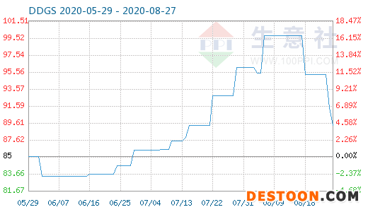 8月26日DDGS商品指數(shù)為89.31,較昨日下降了2.08點(diǎn),較周期內(nèi)最高點(diǎn)100.00點(diǎn)(2014-01-06)下降了10.69%,較2015年11月04日最低點(diǎn)54.04點(diǎn)上漲了65.27%。(注:周期指2014-01-02至今)