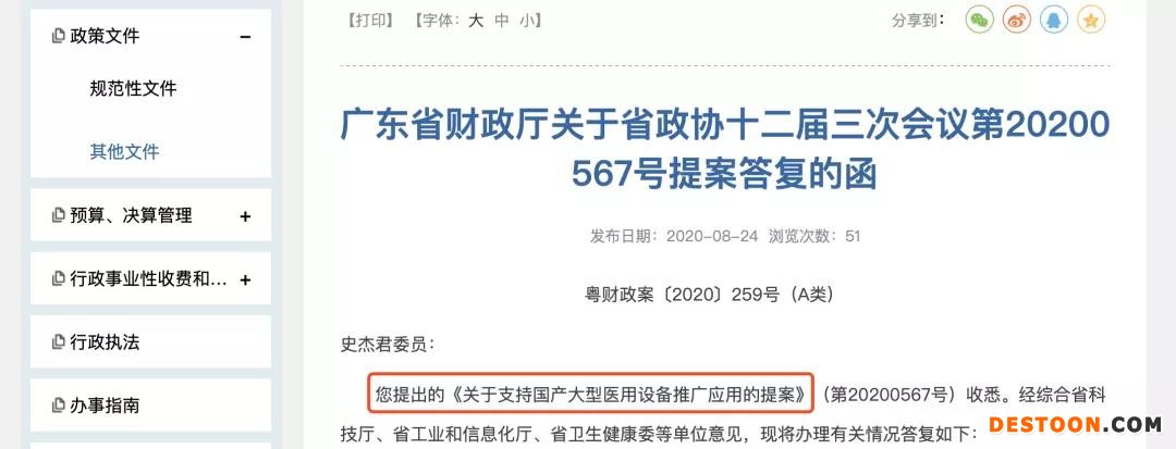 8月24日,廣東省財(cái)政廳發(fā)布《關(guān)于省政協(xié)十二屆三次會(huì)議第20200567號提案答復(fù)的函》,其中關(guān)于支持國產(chǎn)大型醫(yī)用設(shè)備推廣應(yīng)用的提案,經(jīng)綜合省科技廳、省工業(yè)和信息化廳、省衛(wèi)生健康委等單位意見,現(xiàn)將辦理有關(guān)情況答復(fù)如下: