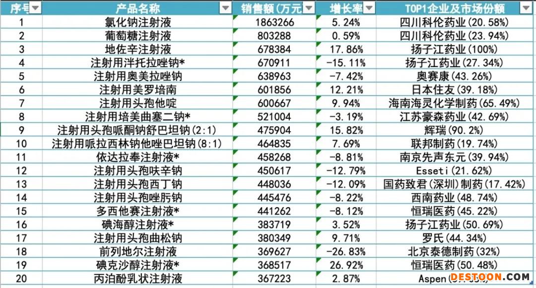 表2 2019年中國公立醫(yī)療機(jī)構(gòu)終端化藥注射劑Top 20產(chǎn)品