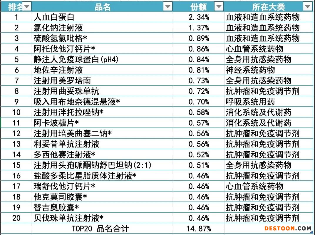 表1 2019年中國城市公立醫(yī)院化學(xué)藥用藥市場Top 20產(chǎn)品市場份額