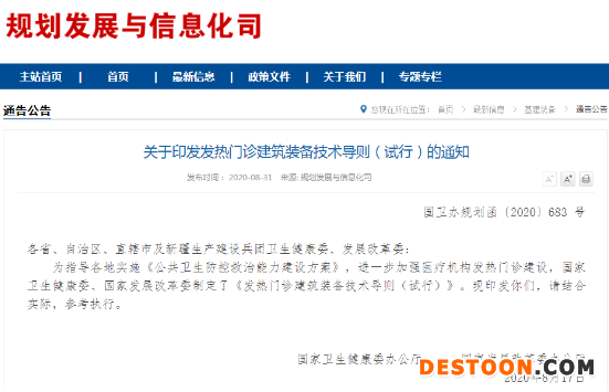 9月3日訊 8月31日,國(guó)家衛(wèi)健委和國(guó)家發(fā)展改革委聯(lián)合印發(fā)了《發(fā)熱門(mén)診建筑裝備技術(shù)導(dǎo)則(試行)》,這也是目前最新的發(fā)熱門(mén)診建筑裝備指導(dǎo)規(guī)范,適用于醫(yī)院發(fā)熱門(mén)診的新建、改建和擴(kuò)建項(xiàng)目。