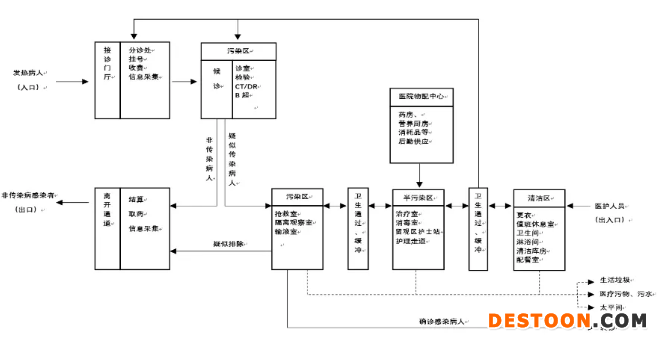 2.5 發(fā)熱門(mén)診應(yīng)當(dāng)合理設(shè)置清潔通道、污染通道,設(shè)置患者專(zhuān)用出入口和醫(yī)務(wù)人員專(zhuān)用通道,合理組織清潔物品和污染物品流線,有效控制院內(nèi)交叉感染。各出入口、通道應(yīng)當(dāng)設(shè)有醒目標(biāo)識(shí),避免誤入。