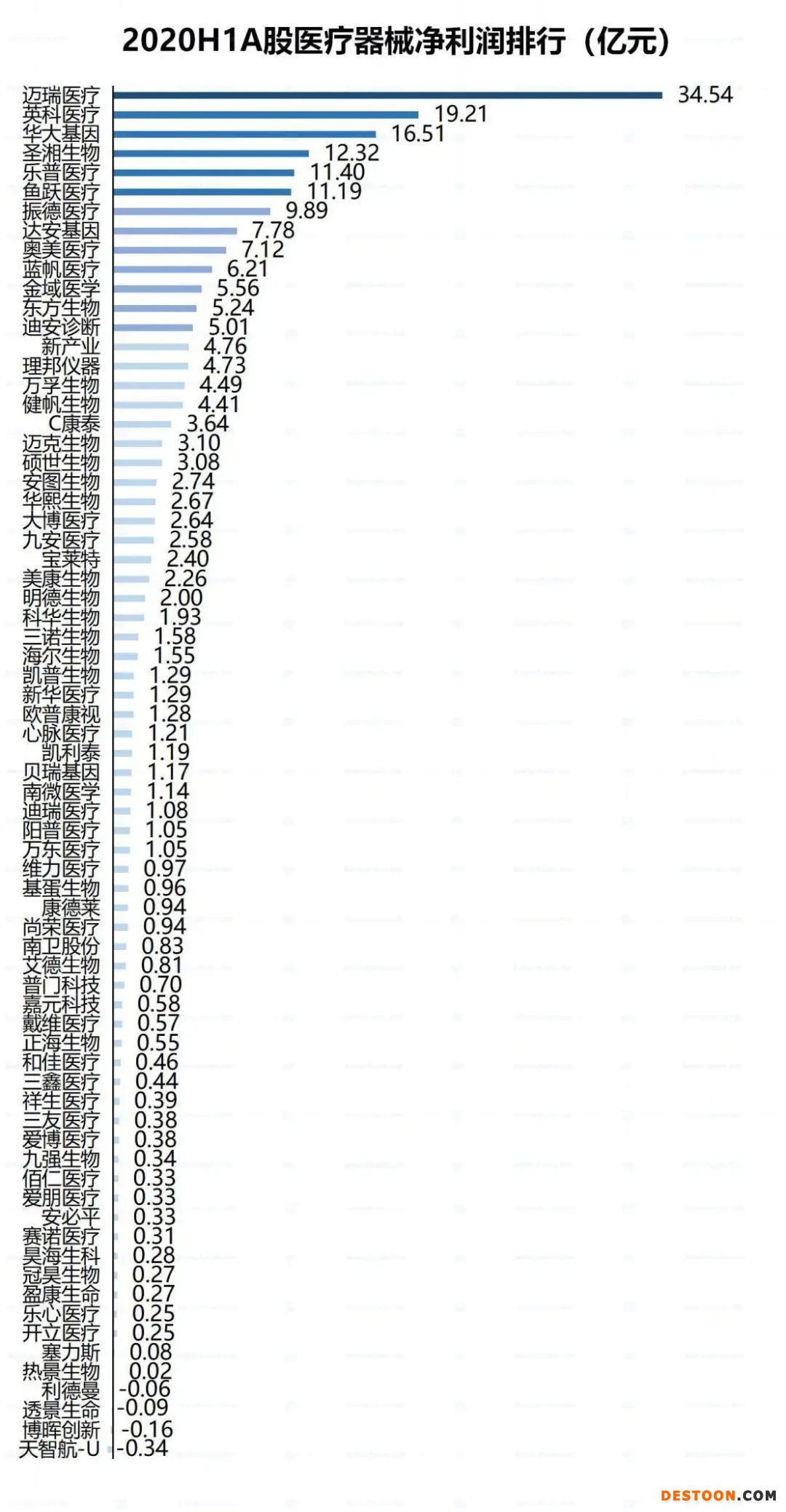 在凈利潤上,邁瑞醫(yī)療34.54億元位列第一;圣湘、樂普和魚躍3家凈利潤均超在10億。但有4家凈利潤虧損。
