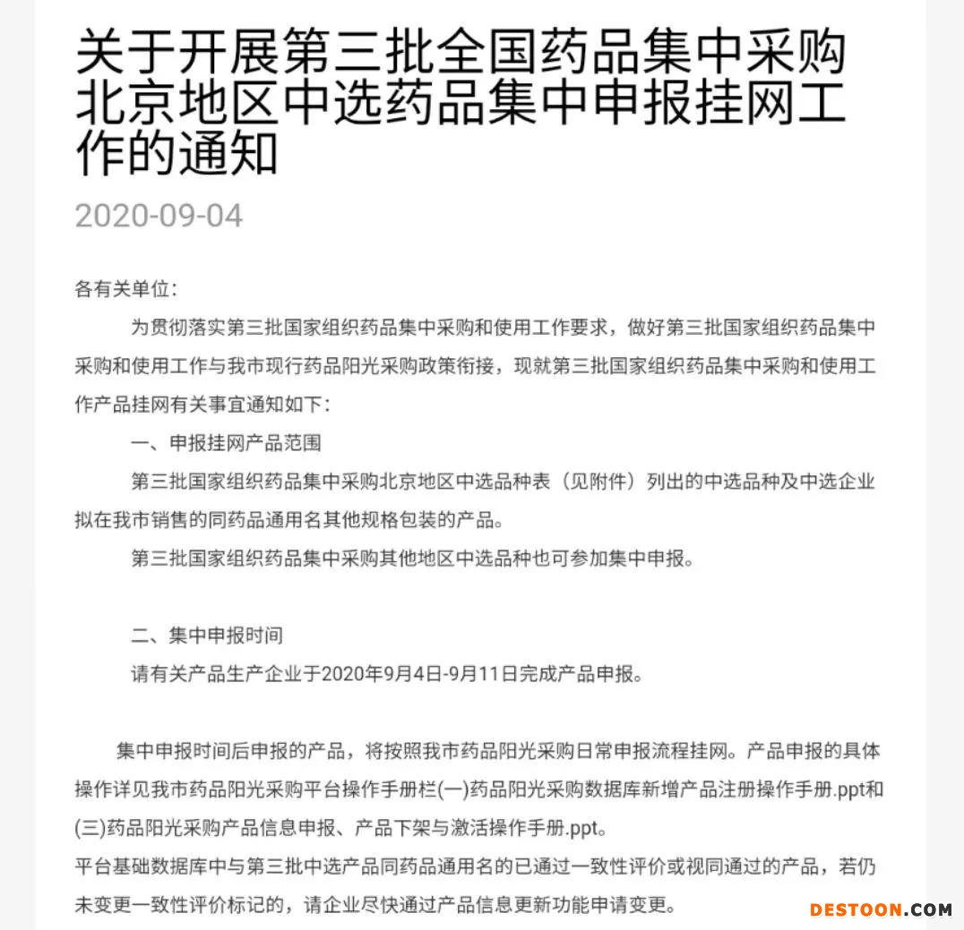 申報時間為:2020年9月4日-9月11日。第三批國家集采北京中選結果如下: