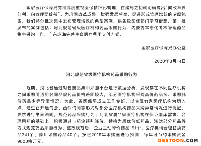 值得注意的是,在8月14日,國家醫(yī)保局在發(fā)布的第一批醫(yī)保管理增效案例中就介紹了河北規(guī)范省級醫(yī)療機構(gòu)藥品采購行為的探索。
