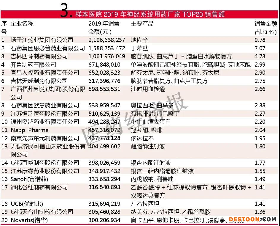 從企業(yè)來看,筆者列出了2019年樣本醫(yī)院神經(jīng)系統(tǒng)用藥銷售額超過3億元的廠家20家。廠家TOP20樣本醫(yī)院銷售額為125.44億元,占神經(jīng)系統(tǒng)用藥銷售額55.85%,TOP10約占四成。頭部企業(yè)都有市場重大戰(zhàn)略產(chǎn)品支撐,如揚(yáng)子江的地佐辛、石藥恩必普的丁苯酞、吉林四環(huán)的腦苷肌肽、齊魯?shù)膯瓮僖核崴募禾巧窠?jīng)節(jié)苷脂等。