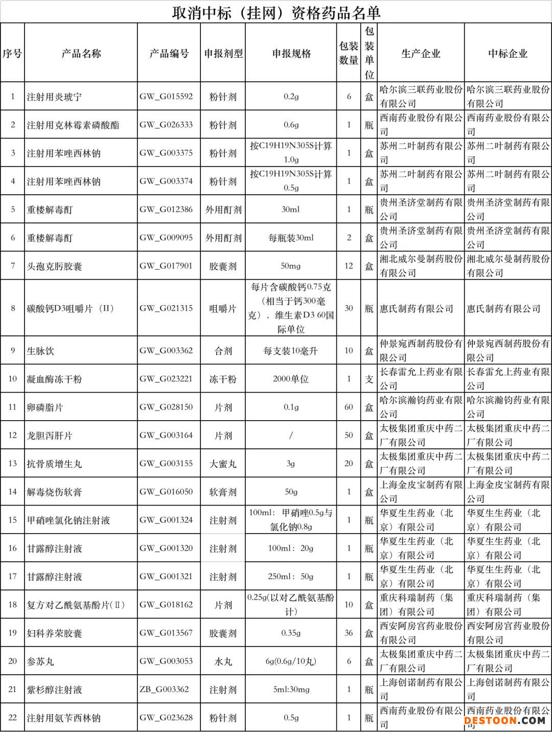 共有22個藥被取消中標(掛網(wǎng))資格,且基本都為包括注射用炎琥寧、頭孢克肟膠囊、生脈飲在內(nèi)的常用大品種,涉及太極集團重慶中藥二廠有限公司、西南藥業(yè)、蘇州二葉制藥有限公司等知名藥企。