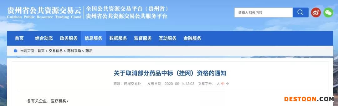 9月16日訊 9月14日,貴州省公共資源交易中心發(fā)布公告,取消部分藥品中標(掛網(wǎng))資格的通知。