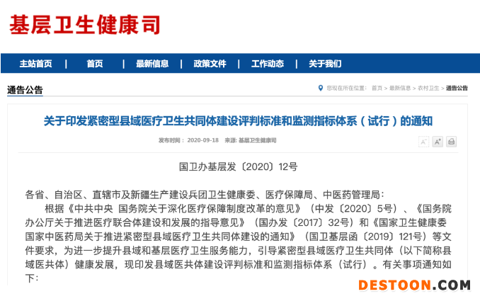 9月21日訊 9月18日,國(guó)家衛(wèi)健委基層衛(wèi)生健康司發(fā)布《關(guān)于印發(fā)緊密型縣域醫(yī)療衛(wèi)生共同體建設(shè)評(píng)判標(biāo)準(zhǔn)和監(jiān)測(cè)指標(biāo)體系(試行)的通知》(以下稱《通知》),指出將進(jìn)一步提升縣域和基層醫(yī)療衛(wèi)生服務(wù)能力,引導(dǎo)緊密型縣域醫(yī)療衛(wèi)生共同體(以下簡(jiǎn)稱縣域醫(yī)共體)健康發(fā)展。