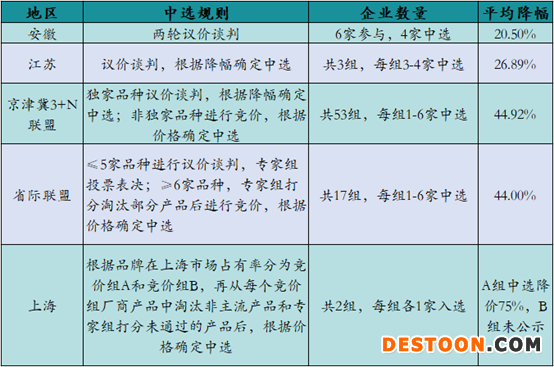 橫向?qū)Ρ戎羞x規(guī)則,在最初進(jìn)行集采的安徽和江蘇兩個(gè)省份,由于參與企業(yè)較少,均采取了議價(jià)談判的方式。安徽省選擇兩輪議價(jià),而江蘇省則根據(jù)降價(jià)的幅度確定中選品種。在參與的企業(yè)數(shù)量增多之后,京津冀3+N聯(lián)盟采用了分組的方式,較少品種的組采取議價(jià)的方式,而較多品種的組采取了競(jìng)價(jià)的方式,這種競(jìng)價(jià)議價(jià)結(jié)合的方式,可以在參加企業(yè)數(shù)量增加后,保證價(jià)格充分降低。在京津冀聯(lián)盟的競(jìng)價(jià)規(guī)則基礎(chǔ)上,省際聯(lián)盟引入了專家組評(píng)分以保證最終中選產(chǎn)品的質(zhì)量,議價(jià)組根據(jù)專家組表決決定入選,而競(jìng)價(jià)組首先根據(jù)專家打分淘汰部分產(chǎn)品后,再在剩余的產(chǎn)品中根據(jù)價(jià)格決定中選。上海市的集采規(guī)則放棄了議價(jià)組,但新增了市場(chǎng)占有率的因素,旨在降價(jià)的同時(shí),不改變臨床的使用習(xí)慣。