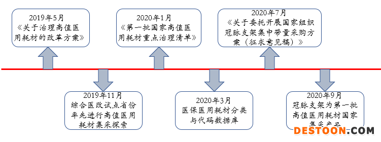 進(jìn)入到2020年,相關(guān)機(jī)構(gòu)又發(fā)布了一系列文件為高值醫(yī)用耗材的國(guó)家集采保駕護(hù)航。這些文件都在為醫(yī)療耗材的管理提供了一個(gè)抓手,解決了過(guò)往醫(yī)用耗材標(biāo)準(zhǔn)不清晰、編碼不統(tǒng)一的問(wèn)題,為深化高值醫(yī)療耗材改革提供了基礎(chǔ)。2020年7月,國(guó)家醫(yī)保局發(fā)布名為《關(guān)于委托開(kāi)展國(guó)家組織冠脈支架集中帶量采購(gòu)方案(征求意見(jiàn)稿)》的文件,并在文中提到從冠脈支架入手探索開(kāi)展國(guó)家高值醫(yī)用耗材集中帶量采購(gòu),推動(dòng)建立規(guī)范化、常態(tài)化的高值醫(yī)用耗材集中帶量采購(gòu)制度,并于9月正式確定了冠脈支架為第一批高值醫(yī)用耗材國(guó)家集采產(chǎn)品。