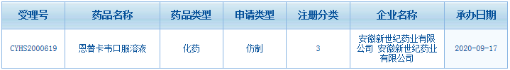 目前,恩替卡韋口服溶液并沒(méi)有企業(yè)獲批。日前安徽新世紀(jì)藥業(yè)以仿制3類申報(bào)上市獲受理,一旦獲批將視同通過(guò)一致性評(píng)價(jià)。在此之前,史達(dá)德藥業(yè)|北京紐拜歐醫(yī)藥、揚(yáng)子江藥業(yè)集團(tuán)江蘇制藥以仿制3類申報(bào)上市在審評(píng)審批中(在藥審中心)。從承辦日期來(lái)看,揚(yáng)子江藥業(yè)集團(tuán)江蘇制藥時(shí)間最早。